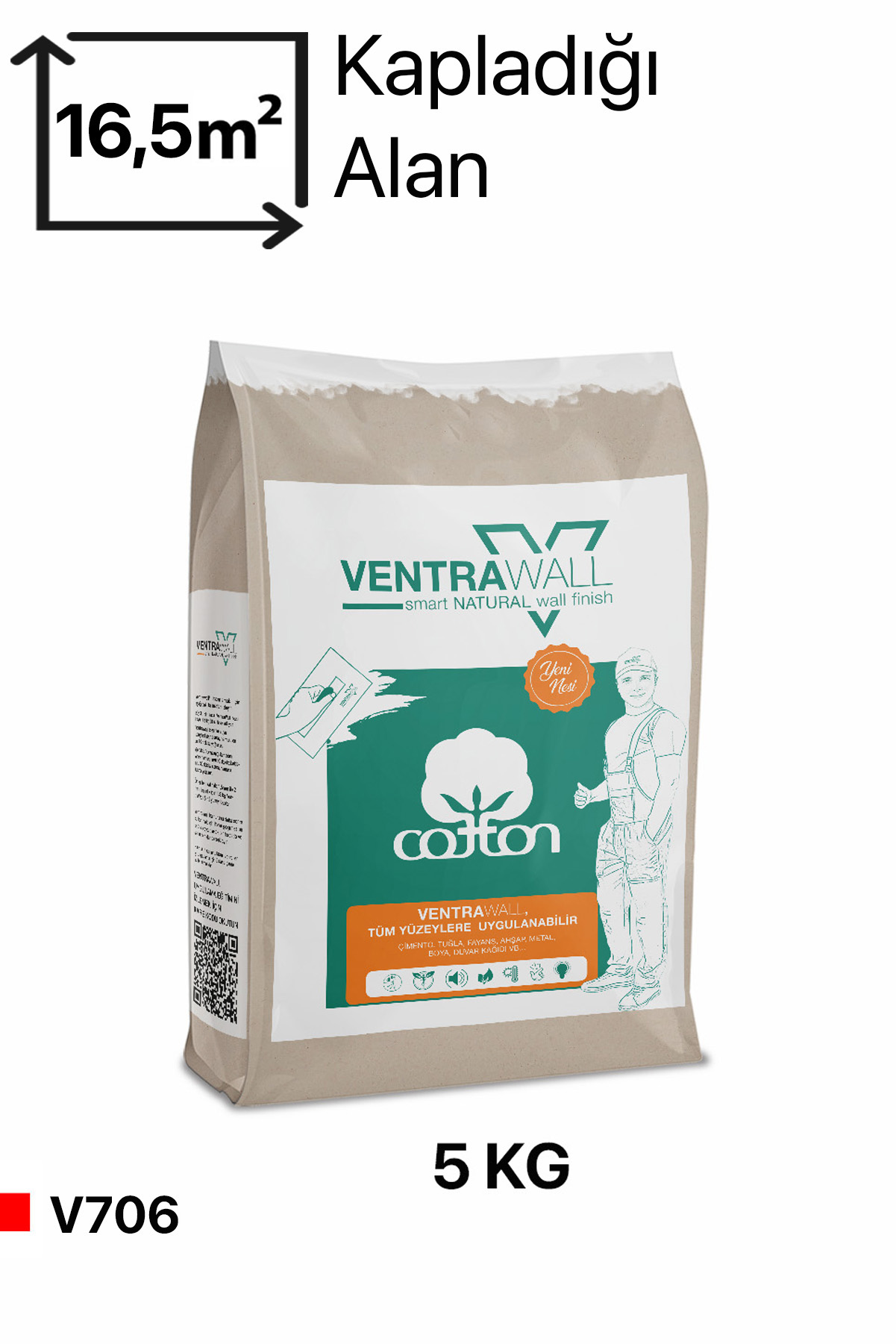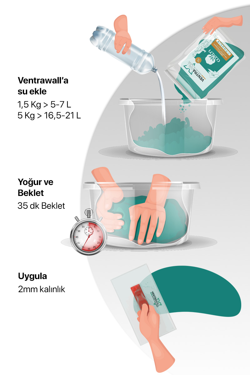 1 paket Ventrawall ile yaklaşık 5 m² alan, 5 KG’lık paket ile yaklaşık 16.5 m² alan kolaylıkla kaplanabilir.